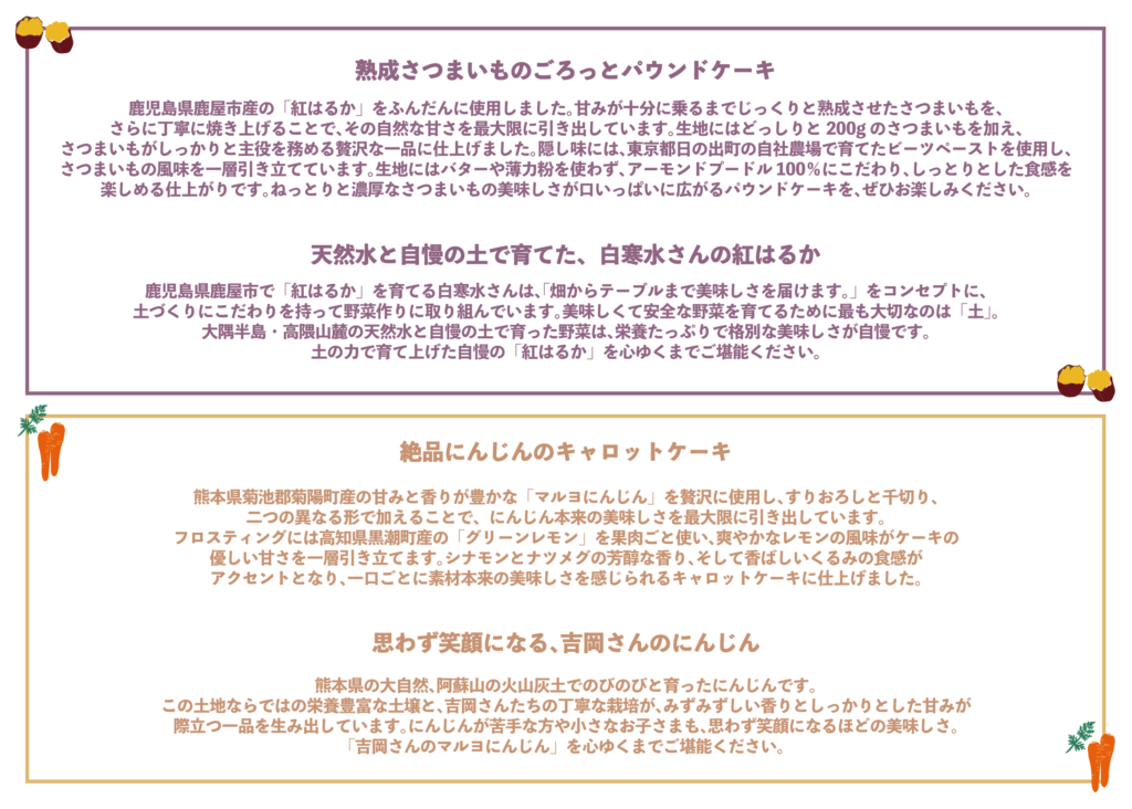 この機会に神楽坂野菜計画の自慢の野菜をふんだんに使ったオリジナルケーキを味わってみてください!